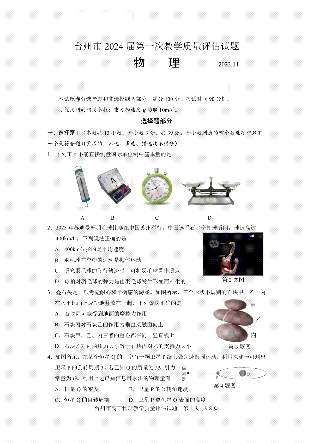 浙江省台州市2024届高三第一次教学质量评估物理试题