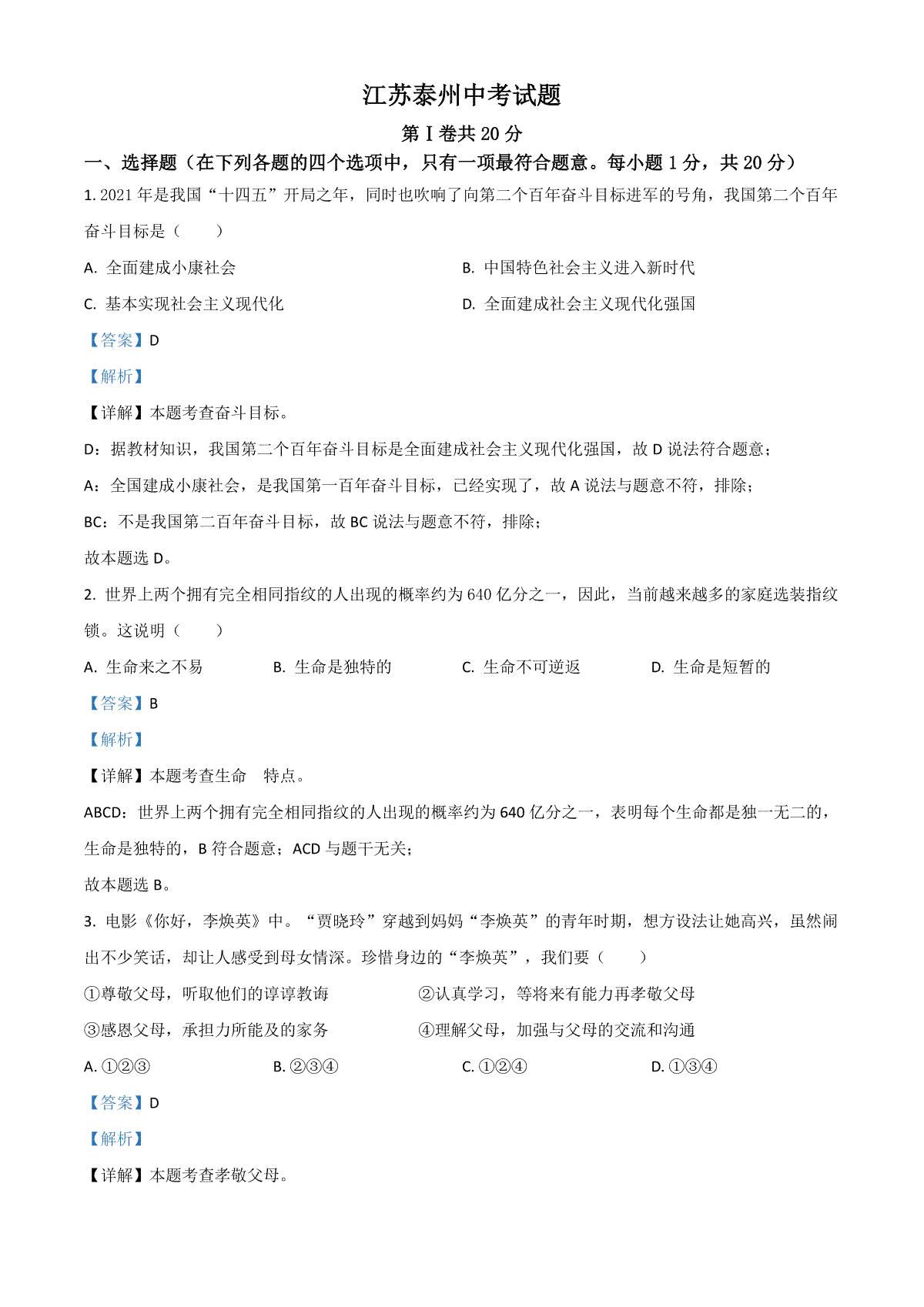 精品解析:2022年江苏省泰州市中考道德与法治真题(解析版)