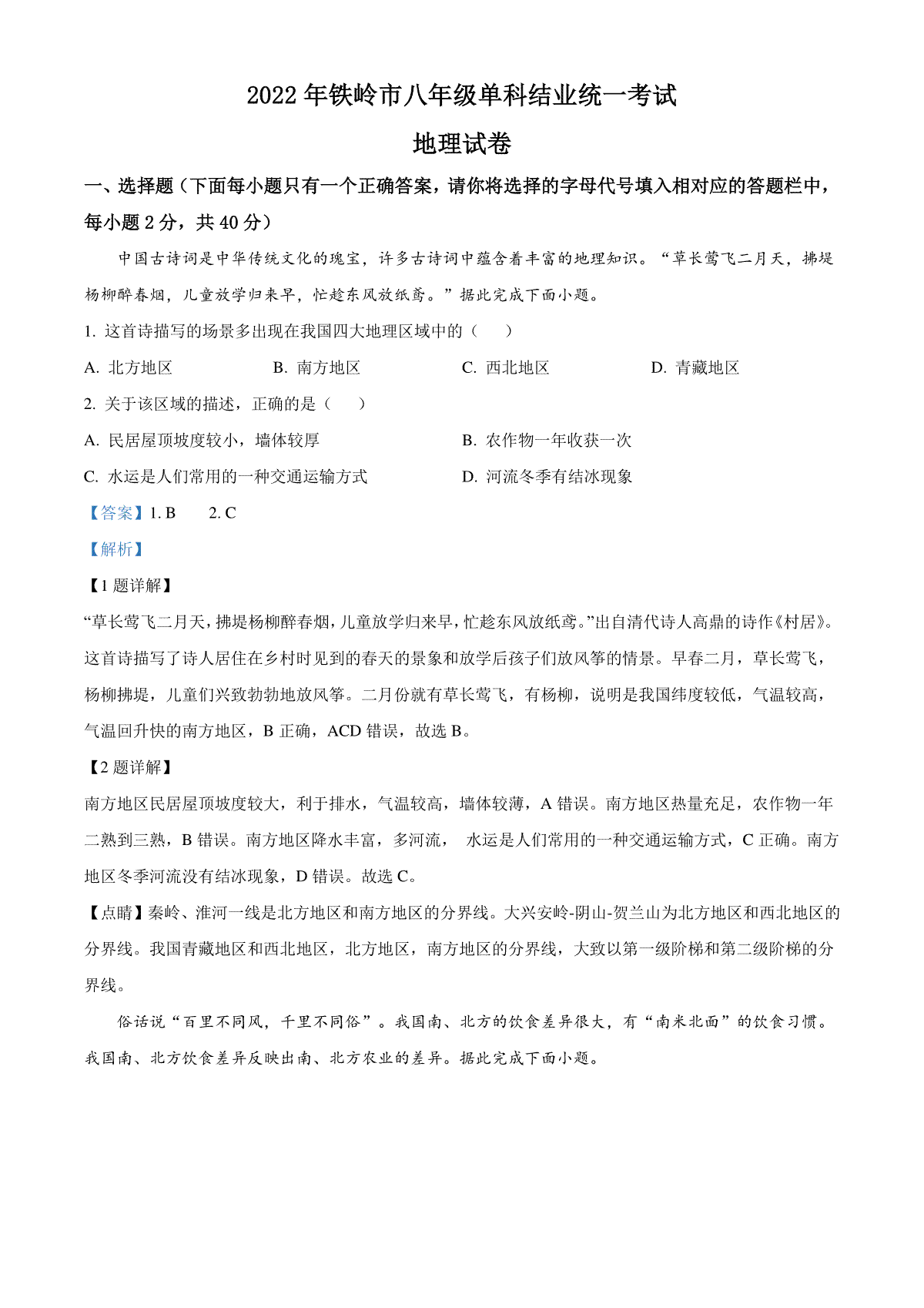 精品解析:2022年辽宁省铁岭市中考地理真题(解析版)