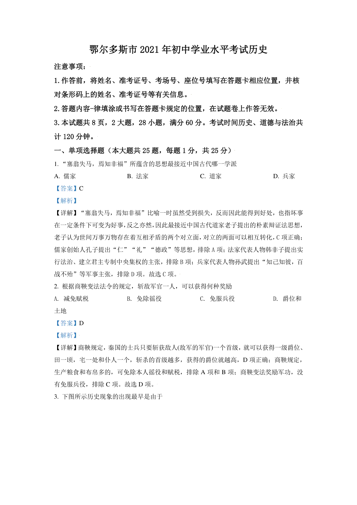 内蒙古鄂尔多斯市2021年中考历史试题(解析版)