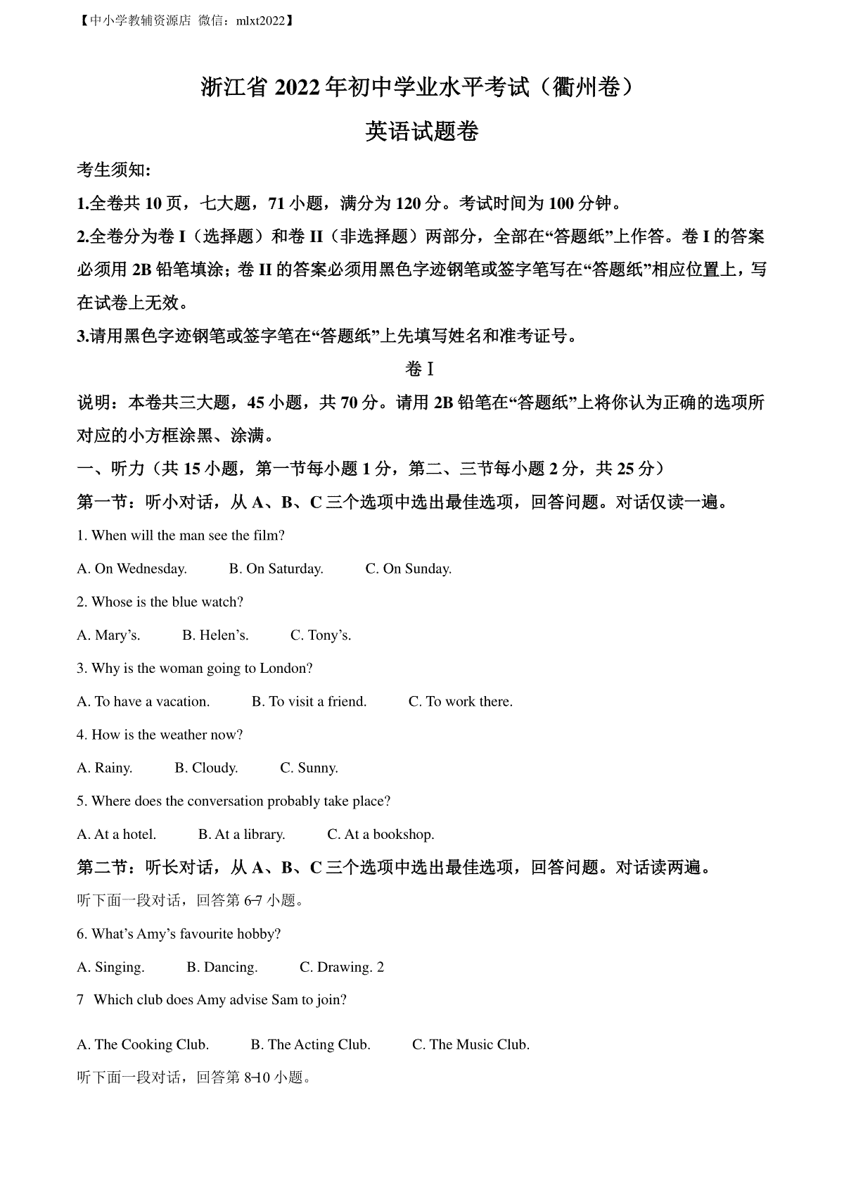 精品解析:2022年浙江省衢州市中考英语真题(原卷版)