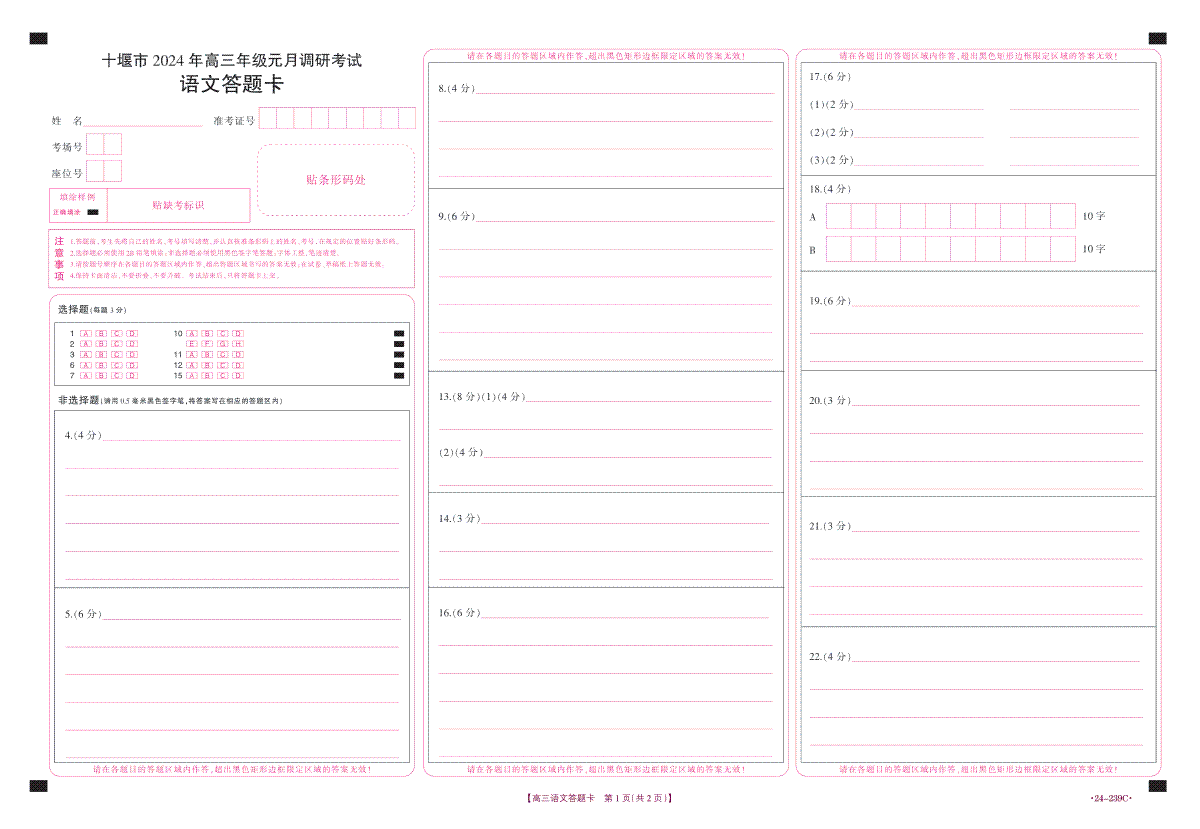 湖北省十堰市2023-2024学年高三上学期期末考试语文答题卡