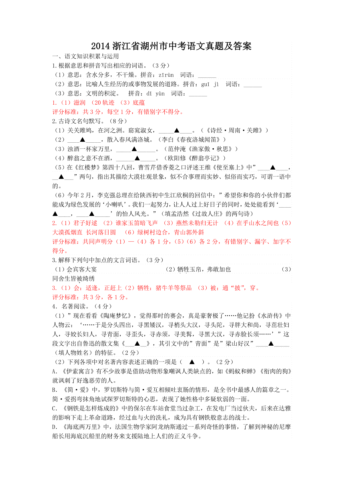 2014浙江省湖州市中考语文真题及答案