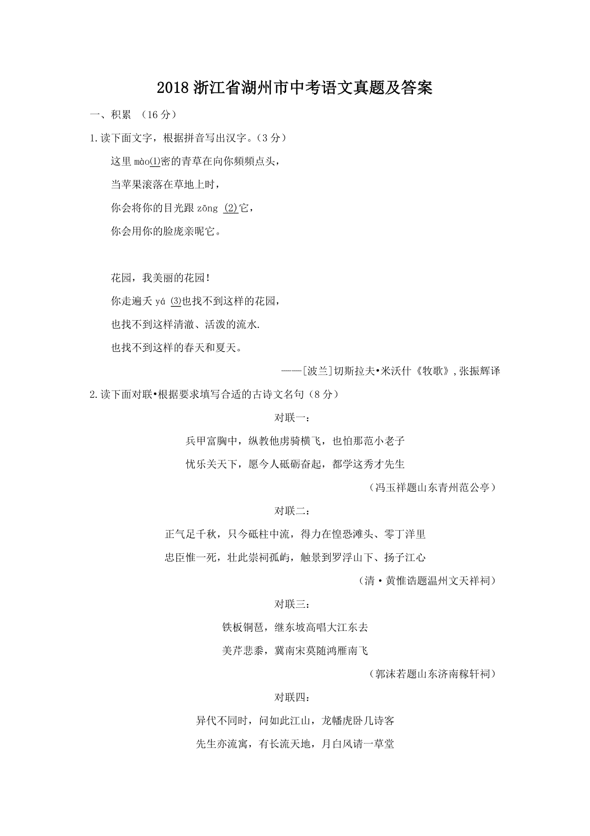 2018浙江省湖州市中考语文真题及答案