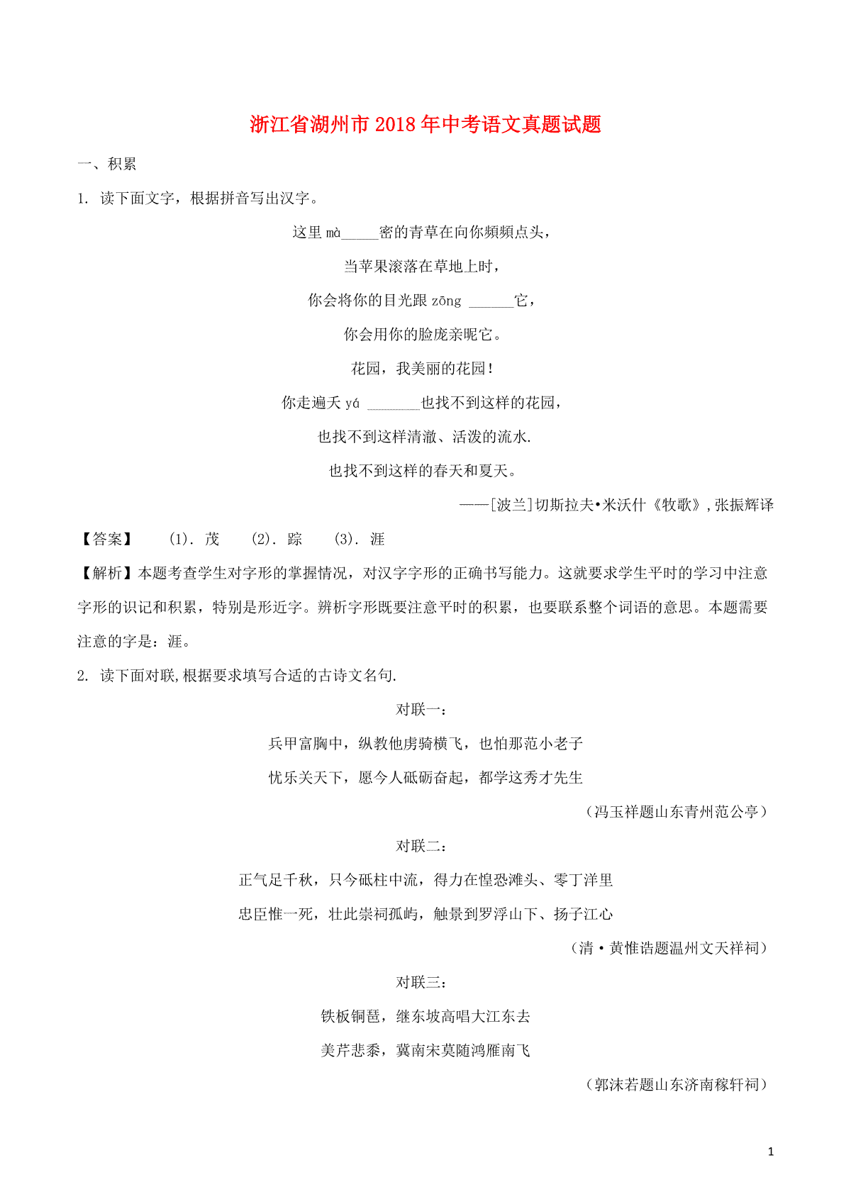 浙江省湖州市2018年中考语文真题试题(含解析)