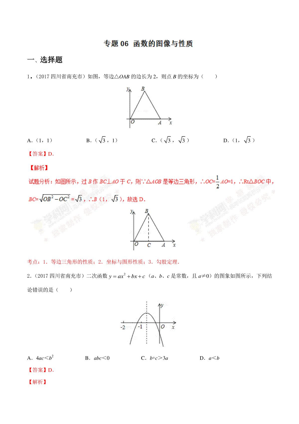 专题06 函数的图像与性质-2017年中考数学试题分项版解析汇编(解析版)