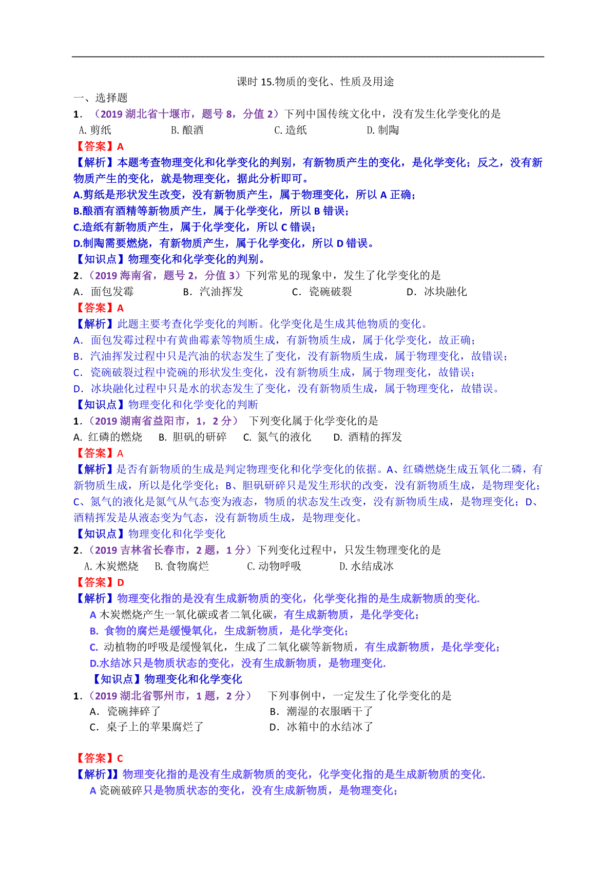 专题1.1 物质的变化、性质和用途(第02期)-2018年中考化学试题分项版解析汇编(解析版)