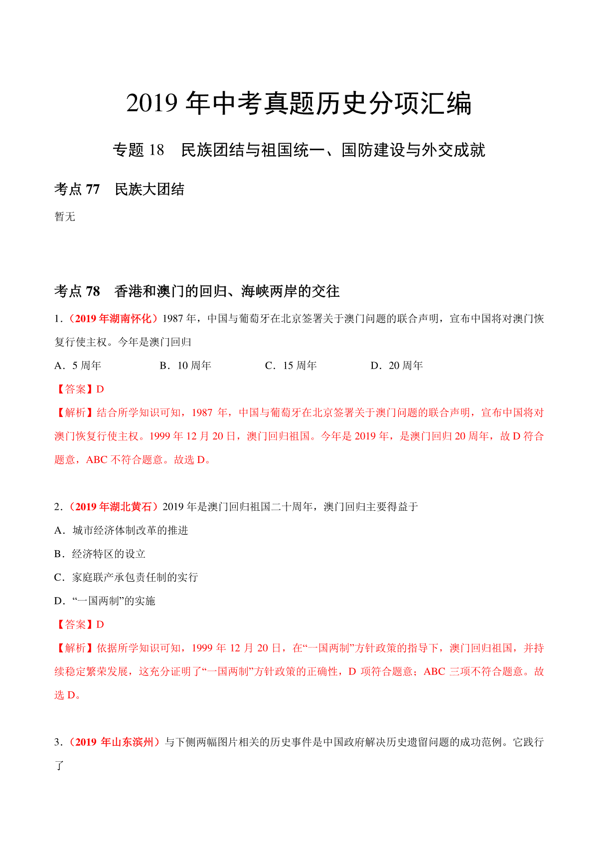 专题18 民族团结与祖国统一、国防建设与外交成就(第01期)-2019年中考真题历史试题分项汇编(解