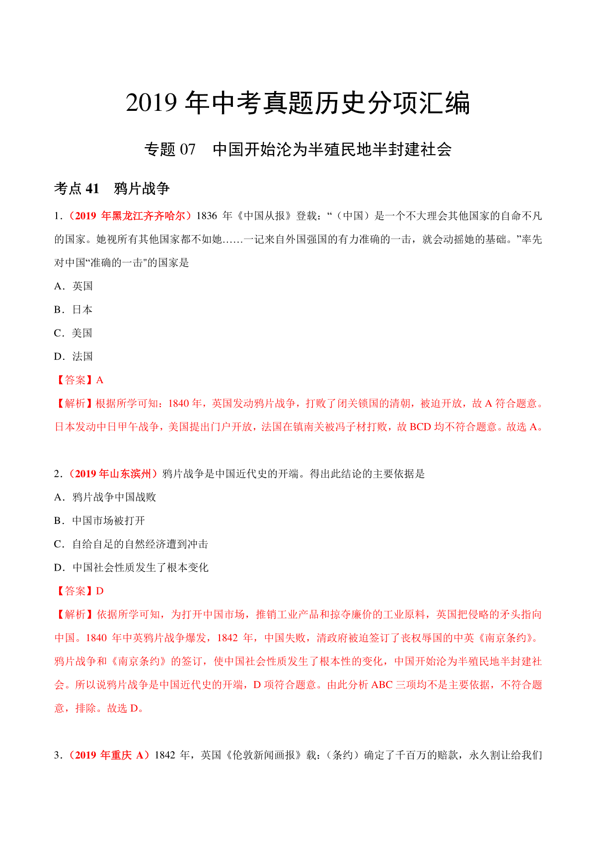 专题07 中国开始沦为半殖民地半封建社会(第01期)-2019年中考真题历史试题分项汇编(解析版)