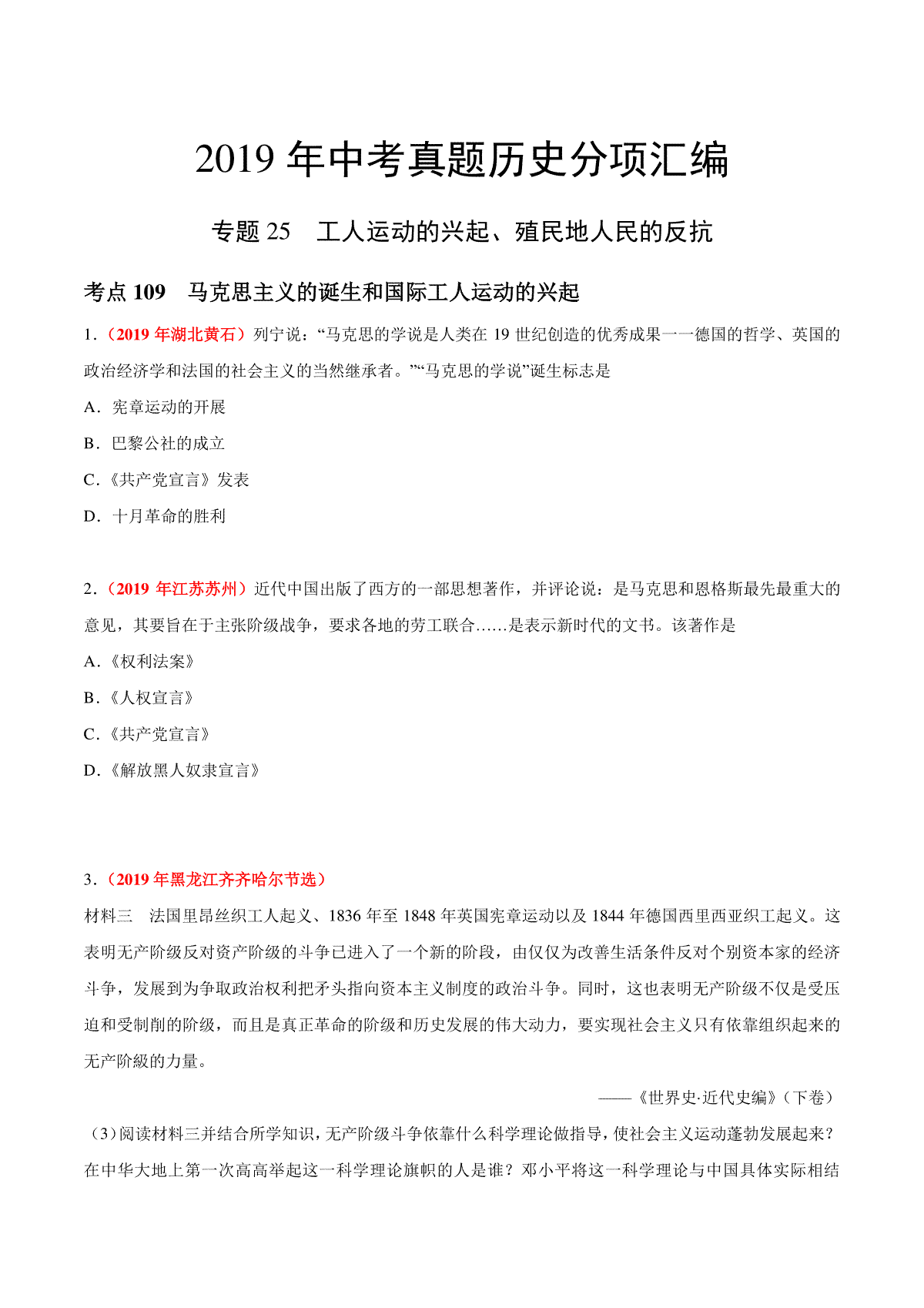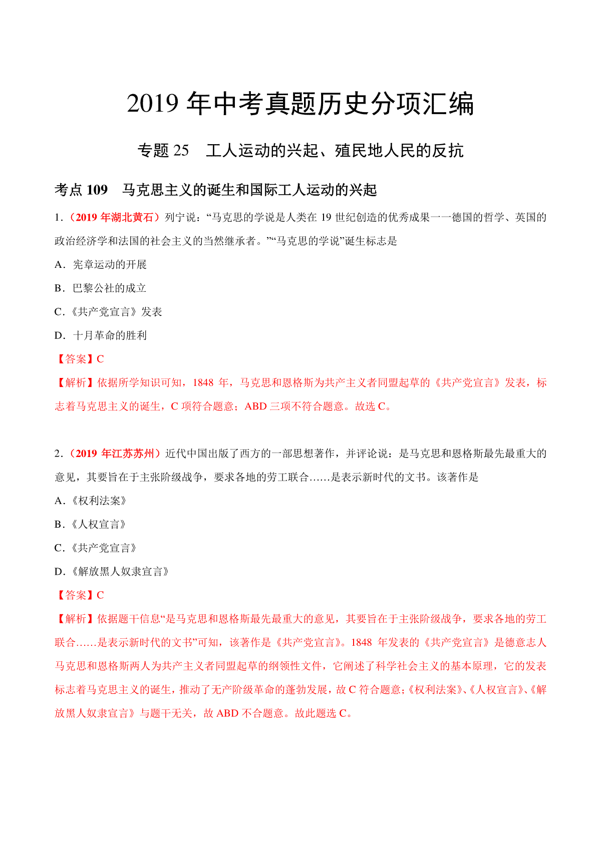 专题25 工人运动的兴起、殖民地人民的反抗(第01期)-2019年中考真题历史试题分项汇编(解析版)
