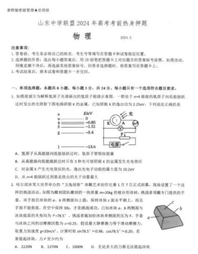 山东中学联盟2024高考考前热身押题物理试题及答案解析