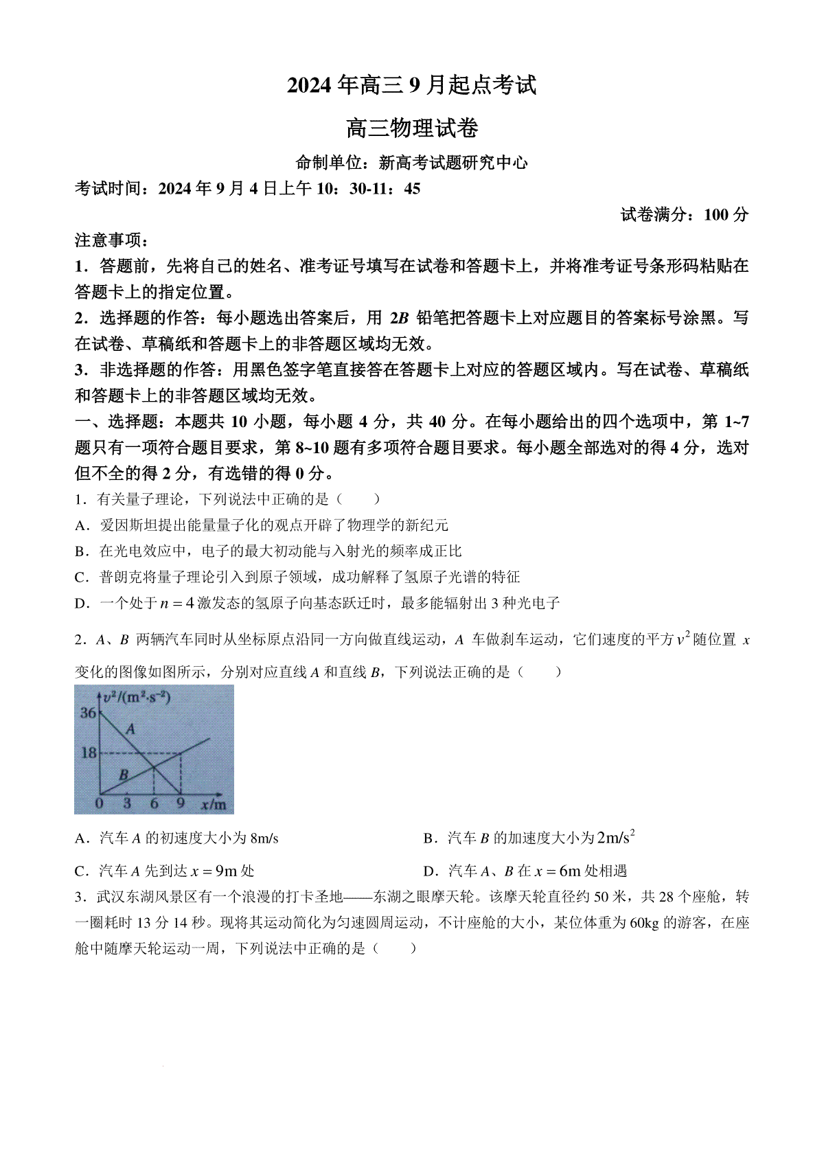 湖北新高考联考协作体2025届高三9月起点考物理试题+答案