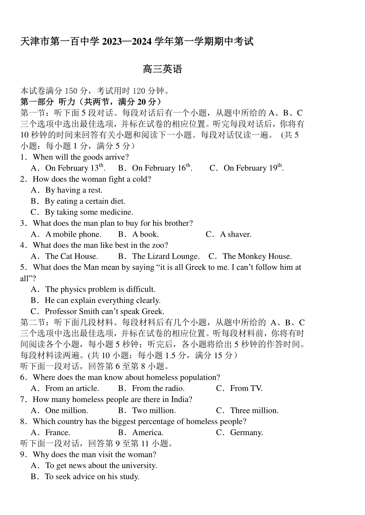 天津市第一百中学2023-2024学年高三上学期期中高三英语试卷