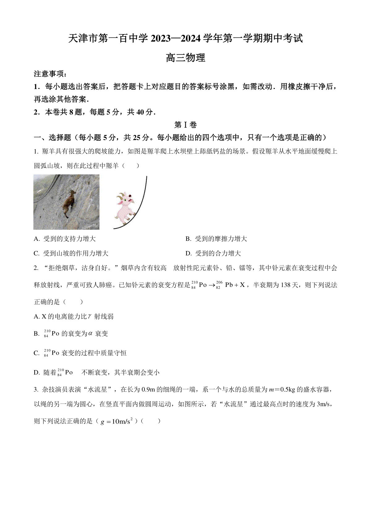 精品解析:天津市第一百中学2023-2024学年高三上学期期中物理试题(原卷版)