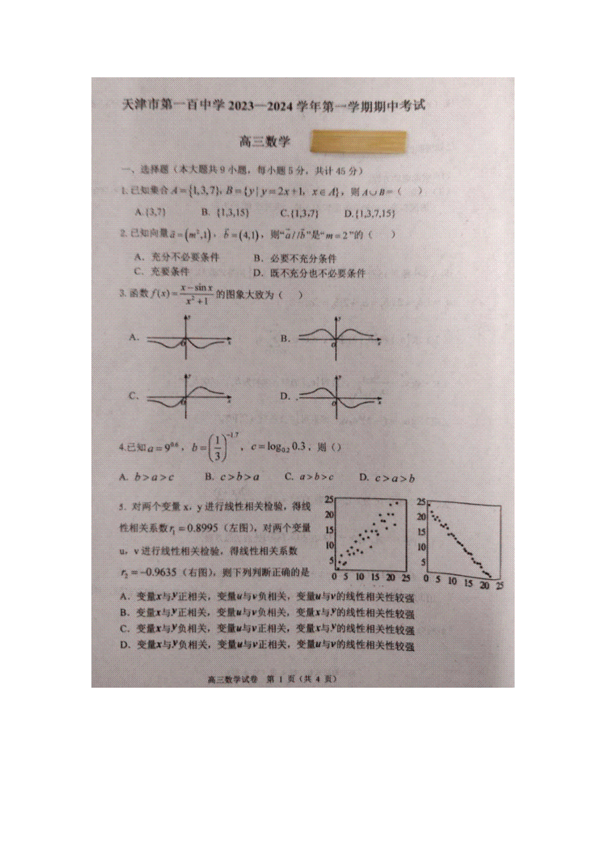 天津市第一百中学2023-2024学年高三上学期期中考试数学试题