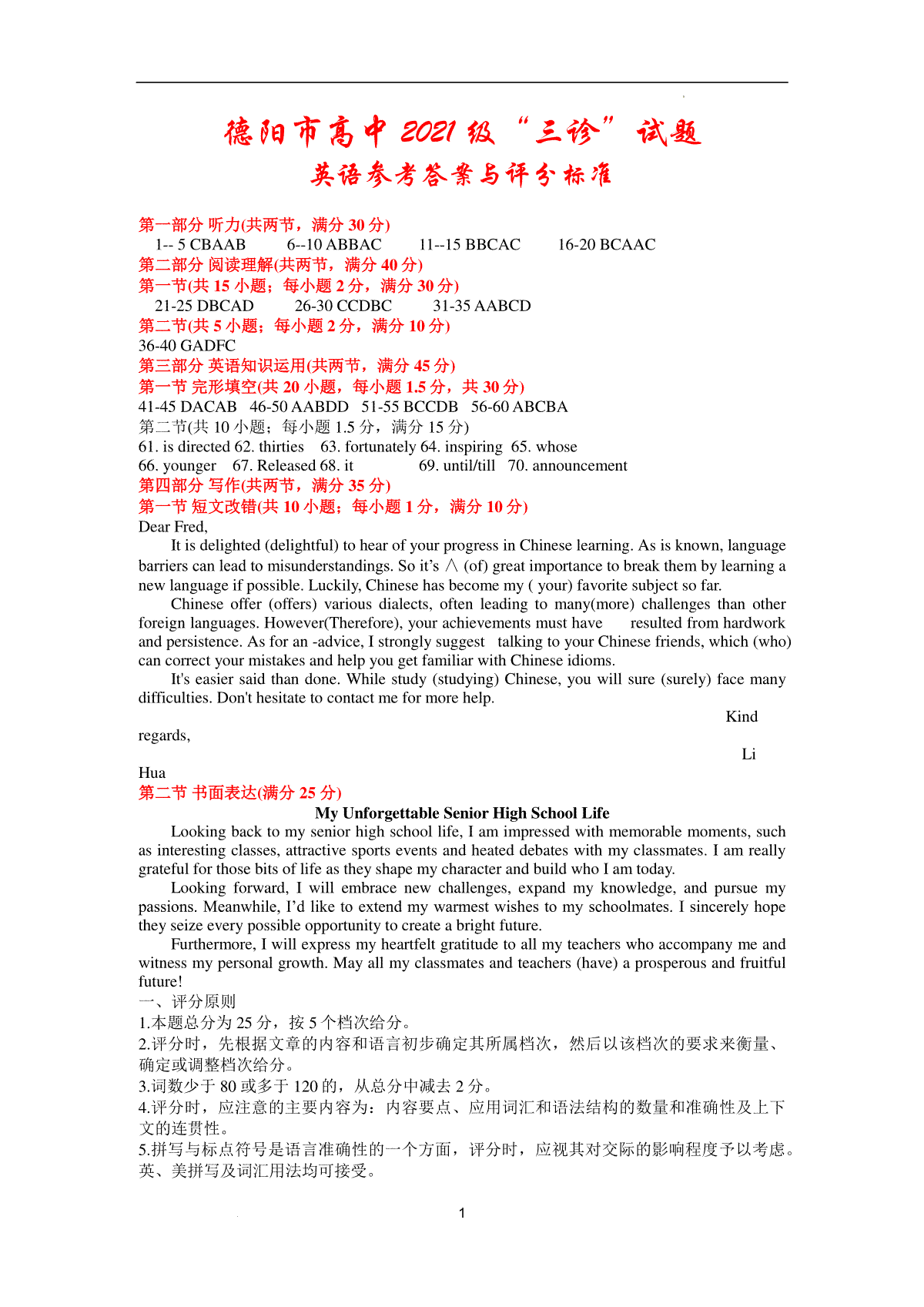 四川省德阳市2023-2024学年高三下学期“三诊”考试(理科)英语考试