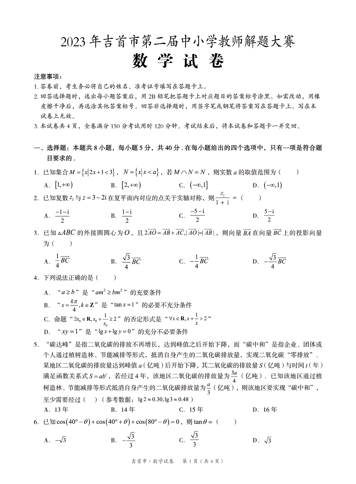 湖南省湘西州吉首市2024届高三上学期第二届中小学生教师解题大赛 数学